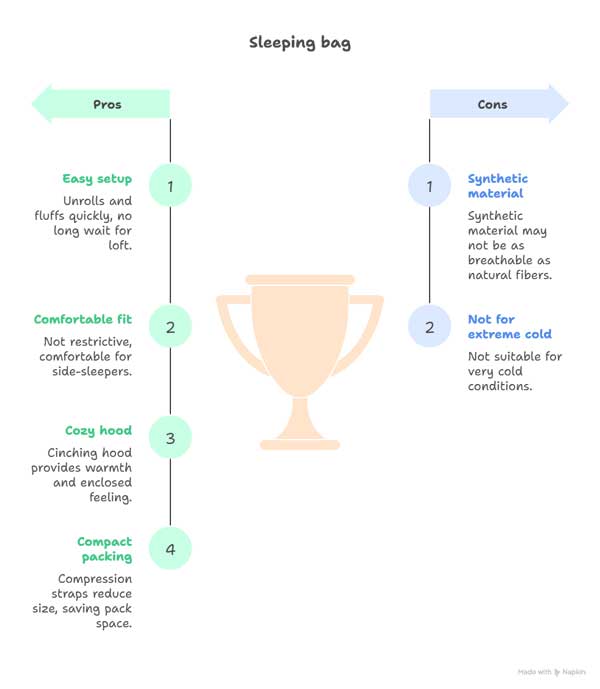 - The Long-Term Question: The polyester lining can feel a bit slippery and less breathable than more premium materials. It’s also difficult to assess long-term durability after one trip. Some online reviews mention a decrease in loft over multiple seasons, which is common for budget synthetic fills.